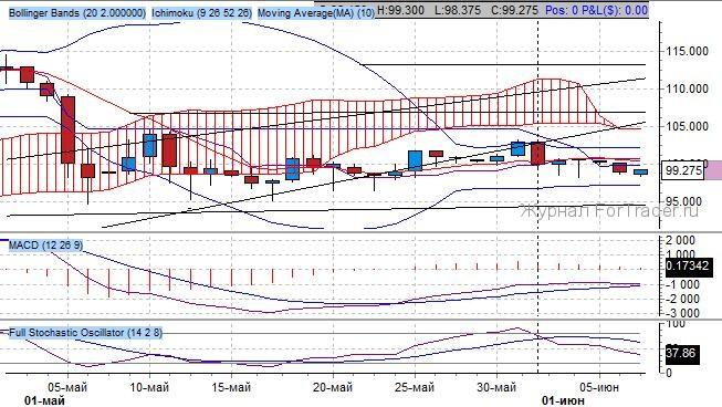 Согласно данным индикатора Bollinger Bands, получен успешный разворот от верхней границы канала, которая уже располагается на уровне 100.00 $/баррель. Ключевые скользящие средние индикатора Ишимоку находятся в понижательном пересечении, при этом быстрая средняя смотрит горизонтально, а медленная – вторит ей – признак смены тренда.