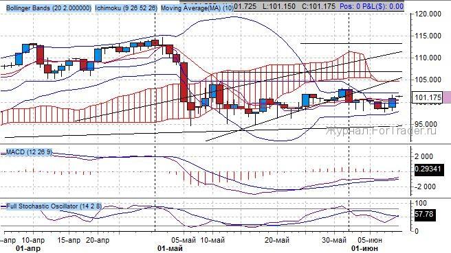 Согласно данным индикатора Bollinger Bands, получен успешный разворот к верхней границе канала, которая уже располагается на уровне 101.00 $/баррель. Ключевые скользящие средние индикатора Ишимоку находятся в понижательном пересечении, при этом быстрая средняя смотрит горизонтально, а медленная – вторит ей – признак смены тренда.