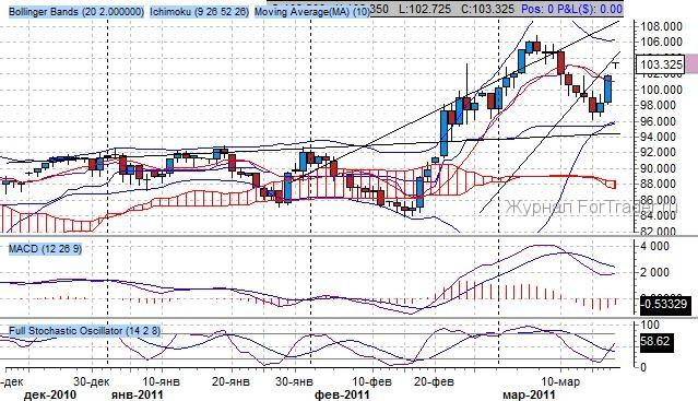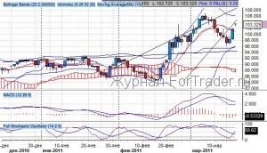Котировки сломили ранее действующую формацию «восходящий флаг» через нижнюю границу на 102.50 пункта, фигура была образована от 20 февраля. Ранее была предпринята успешная попытка выхода котировок вниз из формации на фоне реализации комбинации японских свеч «завеса из темных облаков», образованная от 7 и 8 марта. При этом все внимание на пробой уровня поддержки — 100.00 пунктов – психологический уровень, отскок от него приведет котировки к уровню 95,50 пунктов.