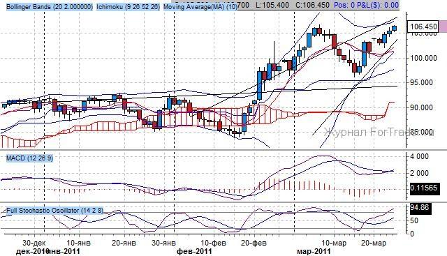 Котировки установили ныне действующую формацию «восходящий флаг» после пробоя уровня 94 пункта от 20 февраля. Ранее была предпринята успешная попытка подъема котировок в рамках восходящего канала на фоне реализации комбинации японских свеч «бычья контратака», образованная от 22 марта. При этом все внимание на пробой уровня сопротивления – 106.50 пунктов – психологический уровень, его преодоление приведет котировки к уровню 108.00 пунктов.