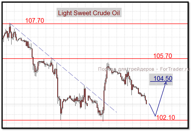 По нашим оценкам, негативный внешний фон заставил спекулянтов повременить с покупками до тестирования областей поддержки 102,10$ Light, 124$ Brent. В этой связи рекомендуется использовать данные области для открытия длинных позиций с внутридневным отскоком к целям 104,50$ и 126$ соответственно. Однако, риски продолжения нисходящей коррекции постепенно возрастают, и судьба нефтяных котировок будет зависеть от общего настроения инвесторов. Падение фондовых индексов и рост американской валюты даст ход котировкам “черного золота” к психологическим рубежам 100$ Light и 120$ Brent.
