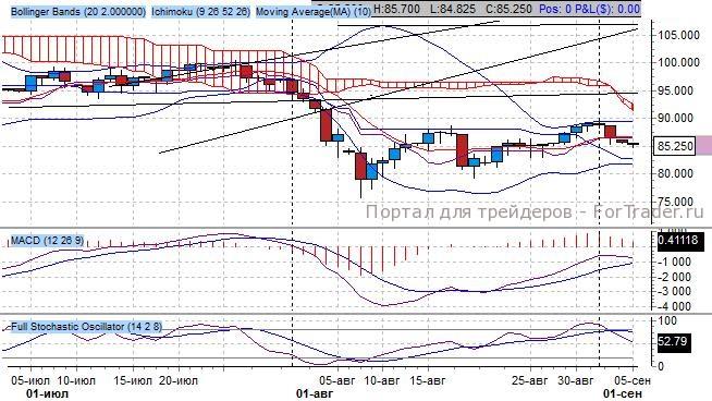 Согласно данным индикатора Bollinger Bands, получен успешный разворот от нижней границы канала, которая была расположена на уровне 80.00 $/баррель. Отмечаем завершение покупок. Ключевые скользящие средние индикатора Ишимоку находятся в повышательном пересечении, при этом быстрая средняя смотрит повышательно, медленная – горизонтально – признак сохранения тренда.