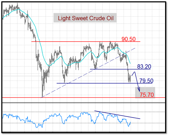 Техническая картина предполагает продолжение развития нисходящей динамики после кратковременной консолидации цен в диапазоне 79.50$-83.20$ Light, 105$-108.70$ Brent. Не исключен вариант стабилизации котировок в установленных рамках до закрытия недельной сессии. В этой связи, рекомендуется использовать область вблизи верхних границ 83.20$ Light, 108.70$ Brent для открытия коротких продаж. При прорыве областей поддержки 79.50$ Light, 105$ Brent котировки устремятся вниз c целями 75.70$, 100-103$ соответственно.