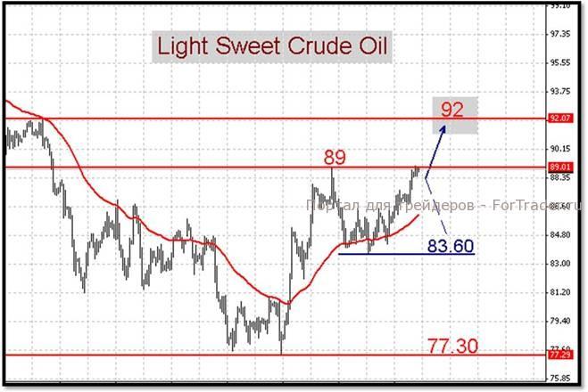 По нашим оценкам, в случае прорыва сопротивления 89$ Light целевым уровнем к восстановлению “американца” выступит отметка 92$ за баррель. Неудача заставит быков отступить, что приведет к возврату котировок на область поддержки 83,60$. Цена сорта Brent, взяв планку 102,50$, имеет хорошие шансы продолжить рост с целью 105$. Точкой разворота для последнего “взлета” является отметка 102,90$