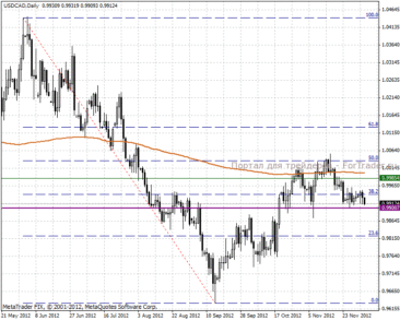 Центральный Банк Канады сохранил базовую процентную ставку на уровне 1% годовых. Банк прогнозирует рост ВВП страны в текущем году на 2.2%, в следующем на 2.3%, а в 2014 на 2.4%. Стоит напомнить, что потребительские цены в Канаде в октябре текущего года повысились на 0.2% в сравнении с предыдущим месяцем, а инфляция в сентябре и августе составляла 0.2%.