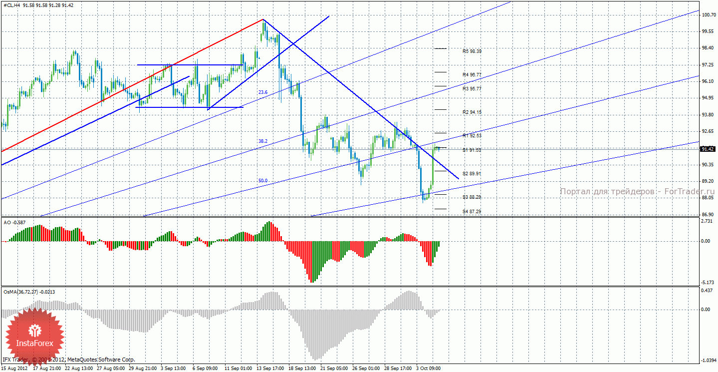 Анализ сырой нефти за 5 октября показывает, что цена не сумела преодолеть уровень S3 и начала восходящую коррекцию, в рамках которой произошло закрепление выше нисходящей линии тренда. Нисходящая линия тренда поддерживала торгующих на понижение, но цена закрепилась выше нее. Нисходящее движение может продолжиться с целями 88,29 и 87,29, но теперь только в случае возврата цены ниже линии тренда. В противном случае, восходящее движение может продолжиться, а нисходящее будет считаться завершенным. Индикатор Awesome показывает текущее восходящее движение, так как последний закрытый бар зеленого цвета. OsMA также направлен вверх, что говорит о восходящем характере движения и в более долгосрочном плане.