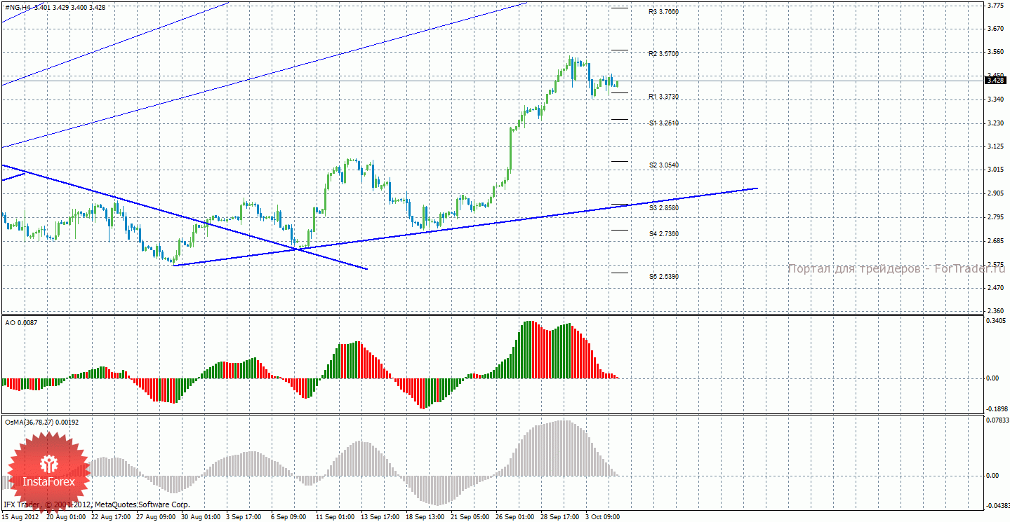 Анализ природного газа за 5 октября показывает, что цена продолжает сильное восходящее движение и скорректировалась к уровню поддержки 3,3730, от которого может отскочить. Целями для продолжения восходящего движения сейчас выступают 3,5700 и 3,7660, но для этого требуется отскок цены от уровня 3,3730. Закрепление цены ниже уровня R1 – 3,3730 укажет на возможное начало коррекции с целями 3,2510 и 3,0540. Новая восходящая линия тренда поддерживает торгующих на повышение, но у нее достаточно малый угол наклона, хотя и слабой ее назвать нельзя. Индикатор Awesome показывает локальное нисходящее движение, последний закрытый бар окрашен в красный цвет. OsMA также направлен вниз, что сигнализирует о нисходящем движении цены на газ и в более долгосрочной перспективе.