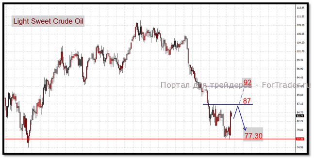 Light Sweet Crude Oil котировки формируют коридор от минимумом 77,50$ с верхней границей 87$. Прорыв выше станет сигналом для реализации восходящей коррекции с целью 92$.