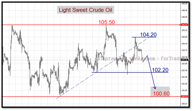 По нашим оценкам, нефтяные фьючерсы, пребывая в узких диапазонах 102,20$-105,50$ Light, 117$-120$ Brent по-прежнему склонны к снижению. Целевым ориентиром для медведей выступают области поддержки 100,60$ и 116,70$ соответственно. В этой связи рекомендуется придерживаться коротких позиций для внутридневных торговых тактик.