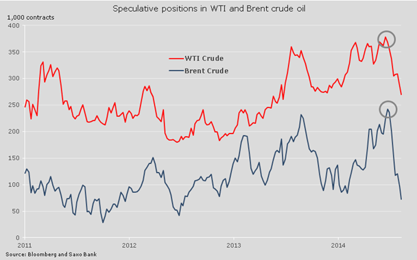 Еще одним объяснением может служить спекулятивное позиционирование хедж-фондов и инвестиционных менеджеров на рынке нефти. После того как в июне чистые длинные позиции по обоим сортам нефти достигли рекордных значений, в ходе начавшихся затем продаж ставки на рост стоимости сорта Brent сократились на 70%, в то время как аналогичные ставки на рынке WTI уменьшились всего на 38%. На этой неделе инвесторы продолжили реагировать на снижение цены на нефть WTI и сокращали длинные позиции.
