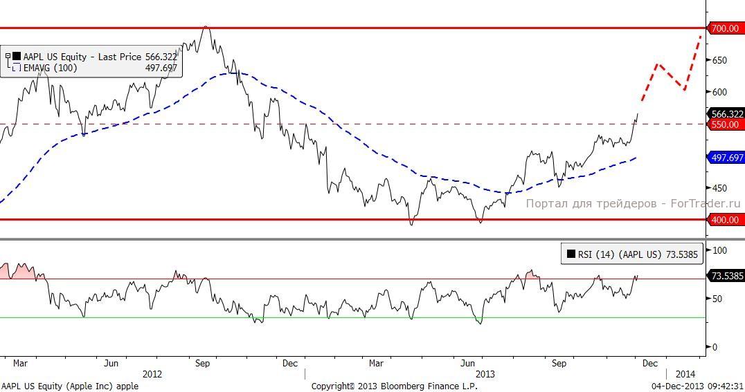 Акции яблочной империи Apple вновь радуют своих инвесторов. Недавние отчеты о победах на японском рынке стремительно укрепляют веру в дальнейший рост. Также поддержку акциям оказывают предновогодний период и давление крупнейших акционеров на главу Apple Тима Кука в сторону увеличения выкупа собственных бумаг с рынка (программа buy-back). Технически, акции с подтверждением преодолели важный рубеж $550, что является серединой диапазона цен $400 – 700. Мы по-прежнему придерживаемся цели $700.