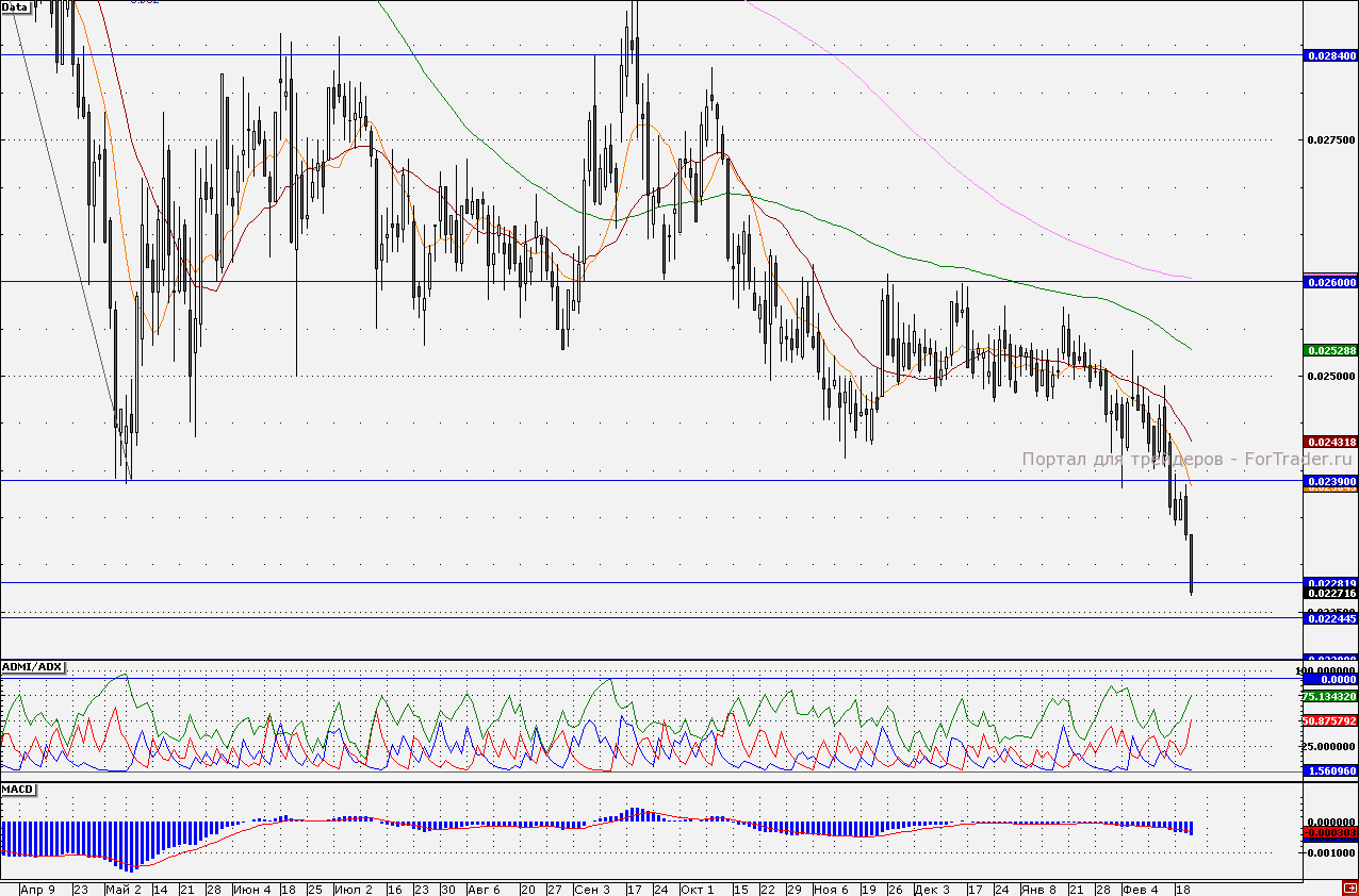На текущей неделе акции «Интер РАО ЕЭС» закрепились ниже важной отметки 23,90 коп., что лишь усилило распродажи. Сегодня акции ушли ниже уровня 22,8 коп., оказывающего поддержку в сентябре 2009 года. Закрепление ниже данной отметки поставит цель в районе 22,5 коп. Трендовые индикаторы не исключают вероятности продолжения нисходящей тенденции. Индикатор ADMI/ADX показывает, что силы «медведей» по бумагам преобладают (линия «медведей» находится выше линии «быков»). Также график индикатора MACD(12;26;9) продолжает снижаться на отрицательной территории. Наш 30-минутный торговый робот находится в «шортах», удерживая короткие позиции от отметки 23,39 коп. Таким образом, короткие позиции стоит удерживать с целью достижения отметки 22,5 коп.