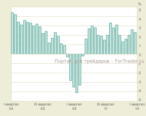 С 2010 года темпы роста ВВП РФ планомерно снижались с 4,5% (2010 г.) до 1,3% (в 2013 году), уступив аналогичному показателю не только среди стран BRICS, но и среди стран G7. В 2014 году ЦБ РФ ожидает замедления ВВП РФ до 1%(г./г.). Причинами стагнации российской экономики служат сокращение инвестиций в основной капитал и приостановка темпов роста цен на основные экспортные товары РФ: нефть и газ, цветные металлы (никель и алюминий), химическую продукцию при сохраняющемся высоком спросе на импорт. Экономика еврозоны, предъявляющая самый высокий спрос на российские энергоносители, по-прежнему находится в сложном положении, в том числе из-за проведения крайне жесткой фискальной политики в странах PIIGS. Другой крупнейший потребитель российского сырья – Китай, также замедляется ввиду структурной перестройки своей экономики.