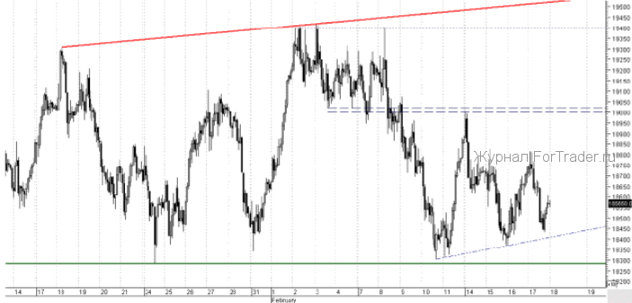 Открытие сегодняшних торгов на срочном рынке ожидается смешанным. Среднесрочная динамика негативная, в отличие от краткосрочной, которая позавчера сменилась на боковую. Ближайшая предполагаемая поддержка на сегодня проходит на отметке 184 150. Основная же линия спроса располагается в районе 183 000, и её пробой просигналит о развитии следующего витка среднесрочного снижения с целями в районе 172 000. Основное сопротивление пролегает на уровне 190 000 и является промежуточной целью покупателей на пути к годовым максимумам, но, стоит отметить, что пока актуальная линия предложения не будет пройдена, игра за лонг остаётся неоправданной внутри негативной среднесрочной тенденции.