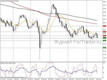 Доллар к японской йене продолжает свое не спешное снижение. Ключевым для пары является диапазон 80,10 – 80,50. В случае преодоления отметки 80,50 пара вероятно вырастет до максимума прошедшей неделе в районе 81,10. Уверенная торговля выше 81,10 может нацелить котировки по данной паре к уровню 82,00. В случае продолжения снижения и пробития 80,10 пара проверит на прочность майский минимум в районе 79,70. Уверенная торговля ниже 79,70 сделает пару уязвимой к падению до 78,60. Скользящие средние на недельном, дневном и четырехчасовом графиках указывают на снижение. RSI на недельном графике нейтрален, а на дневном и четырехчасовом таймфреймах присутствуют признаки перепроданности. Мы занимаем медвежью позицию по данной валютной паре и рекомендуем ее к продаже от 81,10 и 82,00.