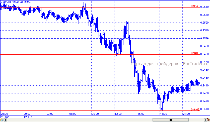 Как и предполагалось, франк в четверг смог отыграть у доллара часть позиций. Уровень 0,9540 стал разворотной точкой, оттолкнувшись от которой пара начала падение, в рамках которого с легкостью прошла поддержку 0,9500 и лишь уровень 0,9480 смог на короткое время приостановить нисходящее движение. Минимум торговых суток пара зафиксировала на уровне 0.9408, но к их завершению все же откатилась к отметке 0,9450.