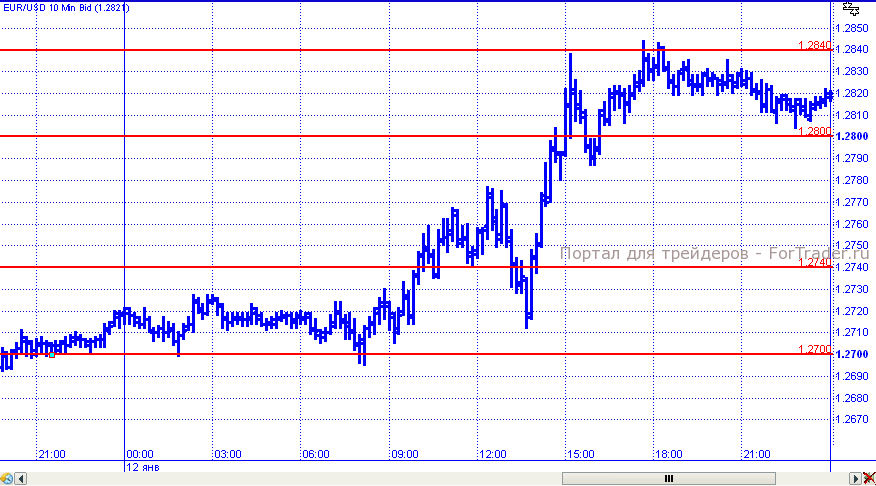 Торги в четверг начались спокойно в пределах диапазона 1,2700 – 1,2740. Однако после открытия европейских рынков евро/доллар смог пройти сопротивление 1,2740 и после краткосрочного отката продолжил рост, в рамках которого с легкостью преодолел сопротивление 1,2800 и зафиксировал максимум на уровне 1,2844. Но на дальнейшее укрепление евро не хватило импульса и остаток торговых суток пара провела в диапазоне 1,2800 – 1,2840.