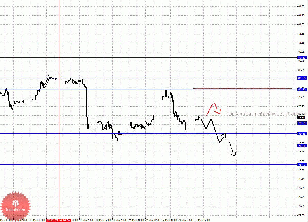 По паре Доллар/Йена ключевыми уровнями являются: 80.83, 80.38, 80.13, 79.39, 79.15, 78.88 и 78.47. Здесь цена по-прежнему находится в области формирования начальных условий для нисходящего движения от 16 мая. Краткосрочное движение книзу ожидаем в коридоре 79.39 – 79.15, отсюда существует вероятность разворота кверху, пробой уровня 79.15 продолжит движение книзу, в данном случае первая цель 78.88. В качестве потенциального значения для низа рассматриваем уровень 78.47, движение к которому ожидаем после пробоя 78.85. Краткосрочное восходящее движение возможно в коридоре 80.13 – 80.38, пробой последнего значения приведет к выраженному восходящему движению, здесь потенциальная цель – 80.83.