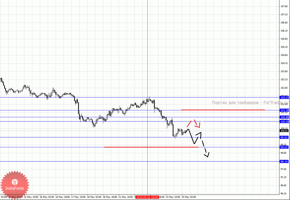 По паре Евро/Йена ключевыми уровнями являются: 102.07, 101.28, 100.86, 100.59, 99.62, 99.02 и 98.14. Здесь мы следим за развитием нисходящей структуры от 22 мая. Продолжения движения книзу ожидаем после пробоя 99.62, в данном случае цель – 99.02, в этом диапазоне консолидация цены. Потенциальным значением для низа считаем уровень 98.14, движение к которому ожидаем после пробоя 99.02. Краткосрочное восходящее движение возможно в коридоре 100.59 – 100.86, пробой последнего значения приведет к углубленной коррекции, здесь цель 101.28, от этого уровня существует вероятность разворота книзу, его пробой будет располагать к формированию восходящей структуры, в данном случае потенциальная цель 102.07.