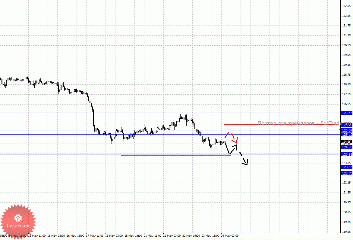 По паре Фунт/Йена ключевыми уровнями являются: 126.44, 125.70, 125.37, 125.12, 124.35, 123.91, 123.14 и 122.75. Здесь мы следим за формированием нисходящей структуры от 22 мая. Краткосрочное нисходящее движение ожидаем в коридоре 124.35 – 123.91, пробой последнего значения должен сопровождаться выраженным нисходящим движением, в данном случае цель 123.14. Потенциальным значением для низа считаем уровень 122.75, по достижении которого ожидаем консолидированное движение в коридоре 123.14 – 122.75. Краткосрочное восходящее движение возможно в коридоре 125.12 – 125.37, пробой последнего значения приведет к углубленному движению, здесь цель – 125.70, пробой которого в свою очередь будет располагать к формированию восходящей структуры, здесь потенциальная цель – 126.44.