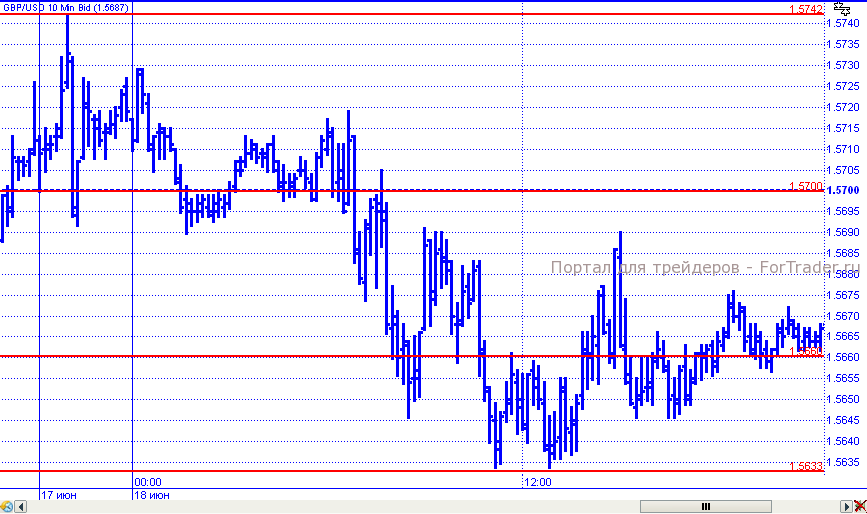 В самом начале торговых суток в понедельник пара отметила максимум на уровне 1,5742. Но поводов для активного укрепления не было, поэтому цены начали нисходящую фазу движения, в рамках которой смогли закрепиться ниже поддержки 1,5700 и 1,5660. Внутридневной минимум цены отметили на уровне 1,5633, от которого к завершению дня откатились вверх и закрылись в районе уровня 1,5670.