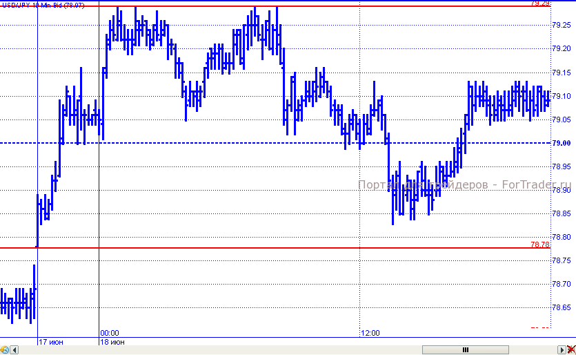 Доллар/иена, как мы и предполагали, в начале торговых суток смогла закрепиться выше уровня сопротивления 79,00. В рамках восходящего движения цены поднимались до отметки 79,30, которая и сдержала рост. Впоследствии иена попыталась отыграть потери у доллара, но не слишком успешно: скатившись к отметке 78,85 цены возобновили рост и к завершению торговых суток снова зафиксировались выше уровня 79,00.