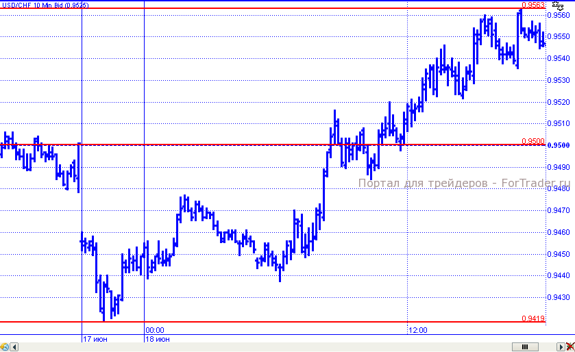 Пара доллар/франк также начала неделю гэпом. Открывшись на уровне 0,9460 цены скатились вниз к отметке 0,9419. Но отсутствие новой порции хороших новостей их еврозоны привело к тому, что пара начала рост. Цены достаточно легко преодолели сопротивление 0,9500 и продолжили подъем, отметив внутридневной максимум на уровне 0,9563. К завершению торговых суток цены немного откатились от него вниз.