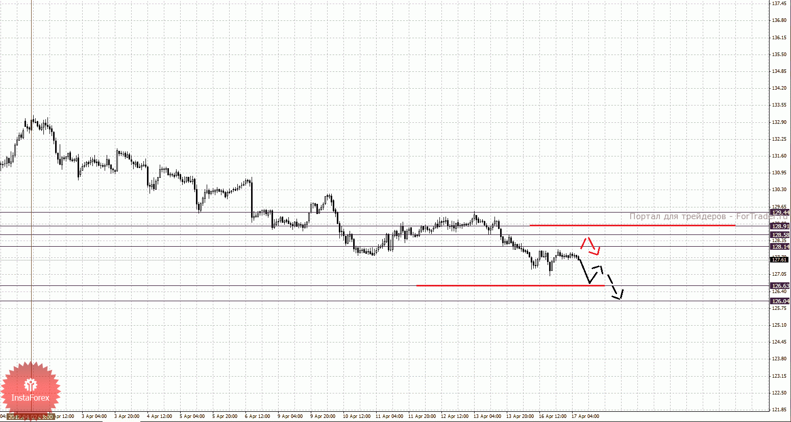 По паре Фунт/Доллар ключевыми уровнями являются: 1.5980, 1.5938, 1.5912, 1.5895, 1.5809, 1.5754, 1.5732 и 1.5688. Здесь цели пока остались без изменения, однако цена близка к уровням для отмены нисходящей структуры 12 апреля. Продолжения развития нисходящей структуры от 12 апреля ожидаем после пробоя 1.5809, в данном случае цель 1.5754, в коридоре 1.5754 – 1.5732 консолидация цены. Потенциальным значением для низа считаем уровень – 1.5688, по достижении которого, ожидаем откат кверху. Корректировочное восходящее движение возможно в коридоре 1.5895 – 1.5912, пробой последнего значения приведет к углубленному движению, здесь цель – 1.5938, от этого уровня высока вероятность разворота книзу, его пробой будет располагать к формированию восходящей структуры, в данном случае потенциальная цель – 1.5980.