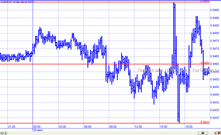 Торговые сутки в четверг пара доллар/франк начала в пределах узкого диапазона 0,9460 – 0,9480. Но впоследствии цены смогли пройти нижнюю его границу и продолжили постепенное снижение к поддержке 0.9430. Первой реакцией на решение ФРС стал резкий рост доллара и пара подскочила к отметке 0,9500, но столь же быстро спикировала вниз к 0,9421. До конца торгового дня пара еще раз пыталась вернуться к сопротивлению 0,9500, но все же закрылась чуть ниже уровня 0,9460.