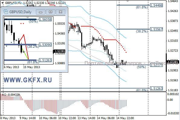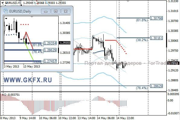 Пара EURUSD вчера после утреннего роста на ожиданиях позитивных данных по Еврозоне немного выросла и затем возобновила снижение. Несмотря на попытки роста, пара продолжает снижаться, и это связано с ростом доллара на ожиданиях возможного изменения политики ФРС США, о чем станет известно 22 мая во время публикации протоколов заседания. До этого момента доллар, по всей видимости, будет стремиться в сторону роста. По этой причине рассматриваем в данное время только продажи. По вчерашней рекомендации сработал безубыток. На эту неделю традиционно рассматриваю два варианта возможного движения цены, основной красный и альтернативный зеленый. Значимые уровни на сегодня отмечены на часовом графике. Индикатор АО находится в отрицательной зоне и снижается, указывая на желание пары двигаться вниз в данное время. Индикатор тренда указывает на снижение. Sell от 1,2940 или выше со стопом 1,2960. Цель 1,2880. Не забываем ставить стоп в безубыток при первой же возможности.