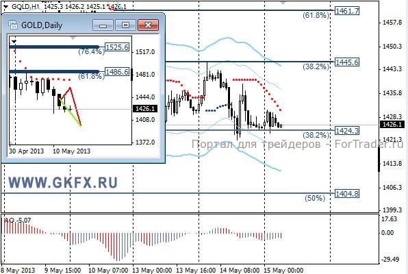 Цены на золото не смогли подняться выше утреннего максимума, и пошли вниз. Рост доллара не позволил золоту подняться выше. Индекс доллара вчера отметился на самой высокой отметке с июля 2012 года. Золото в такой ситуации может продолжить консолидацию либо и вовсе возобновить снижение. Вероятность этого сейчас высока. По вчерашней рекомендации небольшой стоп. Традиционно делаю два варианта движения цены на неделю, основной красный и альтернативный зеленый. Значимые уровни на сегодня отмечены на часовом графике. Индикатор АО находится в отрицательной зоне и растет, указывая на коррекцию перед возможным дальнейшим снижением. Индикатор тренда указывает на снижение. Sell от 1430,0 со стопом 1440,0. Цель 1405,0. Не забываем ставить стоп в безубыток при первой же возможности.