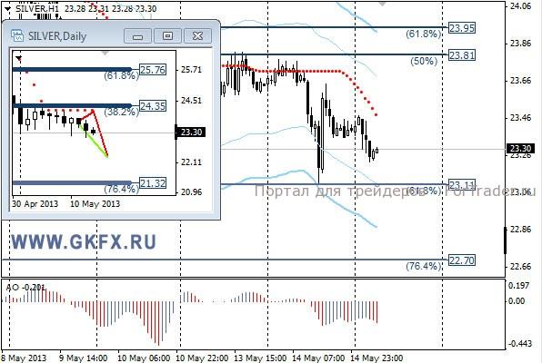 Цены на серебро снижались, и идея с походом наверх не оправдалась из-за роста доллара. По рекомендации сработал небольшой стоп. Традиционно делаю два варианта движения цены на неделю, основной красный и альтернативный зеленый. Значимые уровни на сегодня отмечены на часовом графике. Индикатор АО находится в отрицательной зоне и снижается, указывая на желание инструмента снижаться в данной время. Индикатор тренда указывает на снижение. Sell от 23,35 со стопом 23,65. Цель 22,75. Не забываем ставить стоп в безубыток при первой же возможности.
