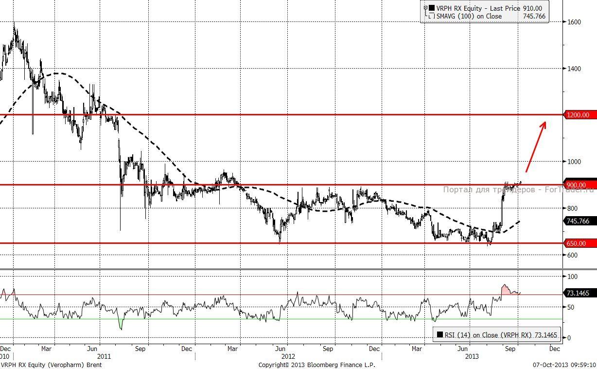 Среди бумаг с невысокой капитализацией рекомендуем обратить внимание на акции Верофарм. Актив около года находится в боковом движении, однако после смены состава акционеров произошел взрывной скачек с 700 до 900 руб., дав повод считать о начале восходящего тренда. Технически, актив выглядит привлекательно для покупок уже по текущим ценам. Цель по акциям 1200 руб.