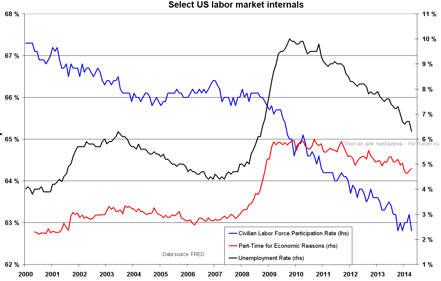После значительного подъема в апреле незначительное ухудшение показателя на изменит мнения на рынке о том, что экономика восстанавливается и положение на рынке труда медленно улучшается. Даже беглого взгляда на развивающиеся тенденции достаточно, чтобы понять, что уровень безработицы стремится вниз, а темпы роста занятости, хотя и сильно колеблются от месяца к месяцу, в среднем составляли 186 000 рабочих мест с начала 2011 года. Если рост полной занятости и снижение процента людей, занятых частично по экономическим причинам, укрепляет оптимизм, то сохраняющийся нисходящий тренд по показателю доли экономически активного населения и отсутствие роста доходов вызывает тревогу: как показали самые последние данные, средняя заработная плата растет всего на 1,9% в годовом исчислении.