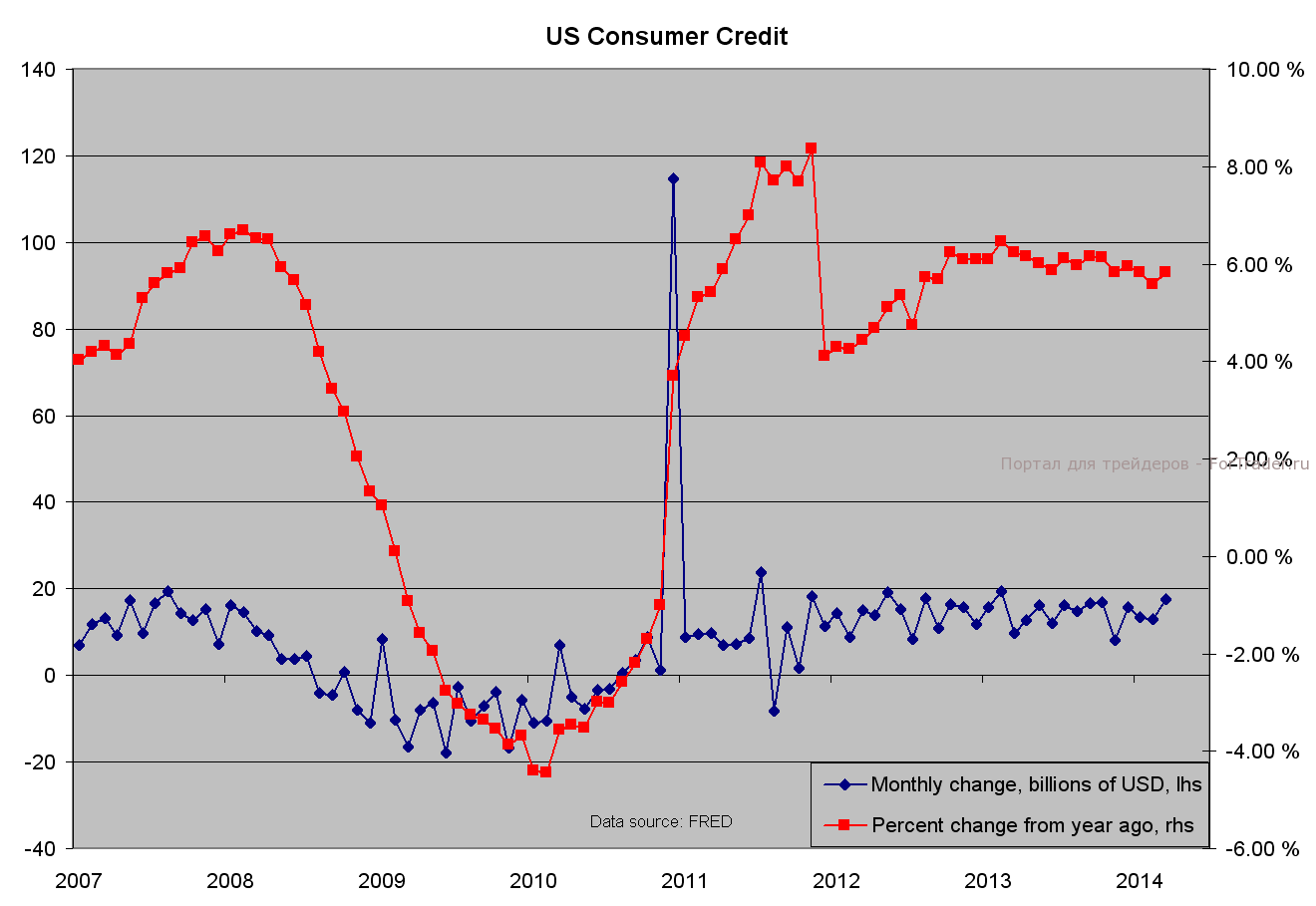 Согласно прогнозам, в апреле кредитование увеличилось на 15 миллиардов долларов после прироста на 17,5 миллиардов в марте. С начала 2012 года диапазон колебаний по месячному показателю составляет от 10 до 20 миллиардов, в результате чего годовой темп роста стабилизировался на уровне приблизительно 6%.