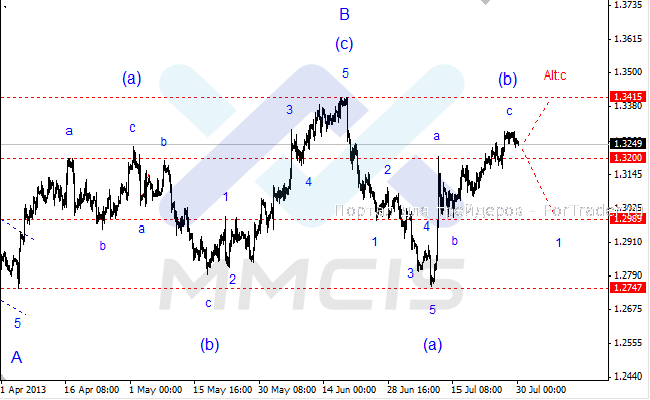 Поэтому в качестве основного сценария рассматривается возможность снижения котировок в виде волны «1» нисходящего импульса «С» старшего порядка. Альтернативный сценарий предполагает прорыв уровня 1.33 и временный рост котировок к отметке 1.3415 в рамках усложненной структуры волны «Alt:c».