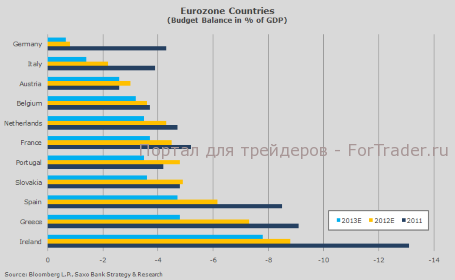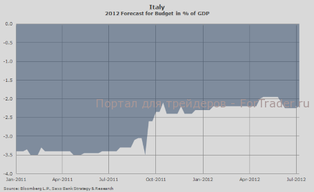 Редко когда СМИ уделяют большое внимание «хорошим» новостям из еврозоны. Мало кто упоминает о том, что Ирландия в ближайшее время вернется на рынок облигаций в качестве эмитента государственных долговых ценных бумаг. Технократическое правительство Италии на самом деле реализовало реформы при широкой поддержке со стороны оппозиционных политических партий и населения в целом. Но опять-таки этому не было уделено должного внимания. Тем не менее, ряд проведенных в Италии реформ уже приносит свои плоды ‒ достаточно хотя бы посмотреть на изменение прогноза сальдо бюджета в процентном отношении к ВВП на 2012 год (см. график ниже). Мне кажется, Италия находится на правильном пути в отличие, скажем, от Испании.