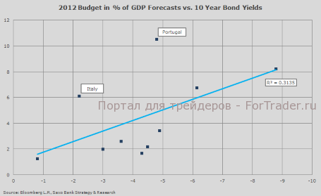 Следующим интересным наблюдением является то, что и Италия, и Португалия платят относительно более высокую процентную ставку по 10-летним государственным облигациям, чем другие страны с прогнозируемым дефицитом бюджета. Я уверен, многие бы удивились, увидев такое значительное расхождение.
