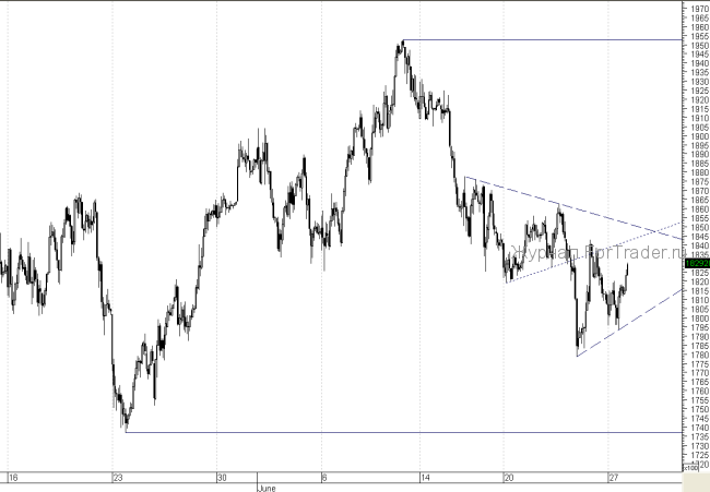 На российском срочном рынке открытие RIU1 с технической точки зрения сформировал в середине диапазона 195 000 – 174 000 сходящийся треугольник, который отражается неуверенность большинства спекулянтов в направлении дальнейшего движения. И эта неуверенность играет на руку в данной ситуации быкам с дальними стопами, которые могут пересиживать неблагоприятный внешний фон в позициях. Ближайшая поддержка на сегодня располагается на отметке 180 000. Ближайшее сопротивление предполагается в районе 184 500. Летний период даёт о себе знать снижением объемов торгов некачественной отработкой российским фондовым рынком движений на зарубежных площадках, где сохраняется основная тенденция к снижению из-за вывода средств из активов, в преддверии окончания QE2.