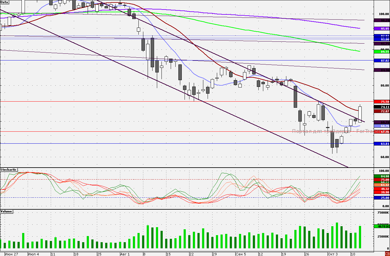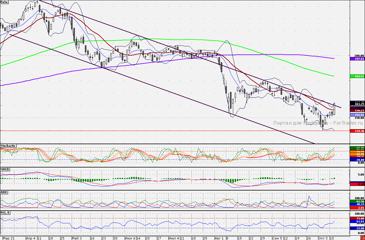 Акции компании закрылись накануне чуть выше верхней границы нисходящего канала, но внешний фон не располагает к продолжению покупок. Поддержкой по бумагам является 160 руб. Пробитие вниз данной отметки способствует тестированию 21-дневной скользящей средней – 156,21 руб. Сопротивлением является отметка 162,5 руб.