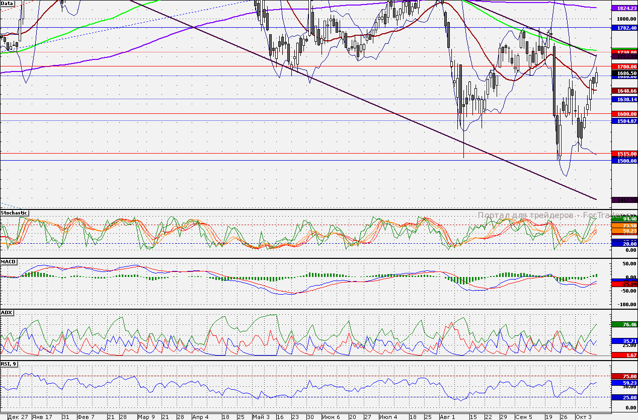 Ближайшие уровни сопротивления: 1700,00/1730,00