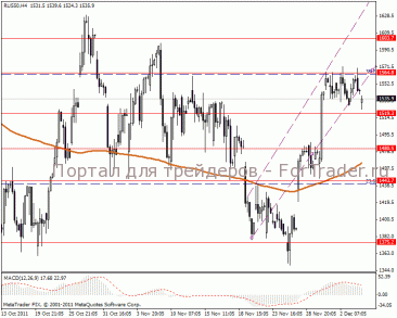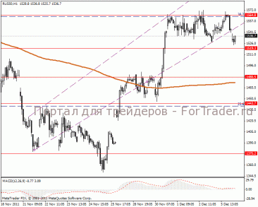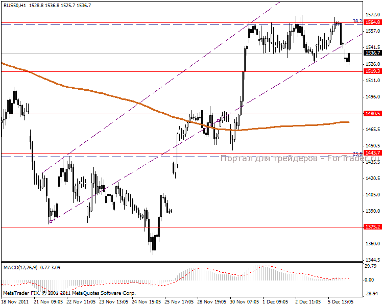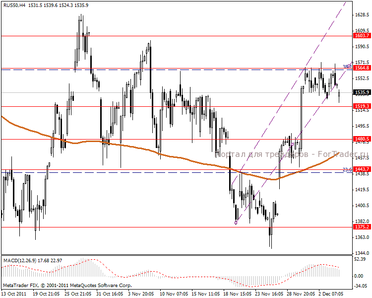 Четырех часовой ценовой график показывает, что возможен пробой линии поддержки и просадку к центру канала 1519.3-1480.5 пунктов. MACD говорит об ослаблении позиции индекса.