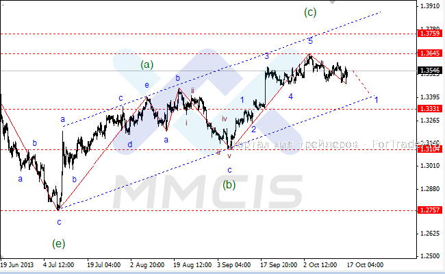 Основным сценарием по-прежнему остается снижение пары к нижней границе восходящего канала в районе отметки 1.3440, где будет завершена волна «1» нисходящего импульса. Альтернативный сценарий предполагает завершение волны «1» в районе текущих минимумов и коррекционный рост пары к отметке 1.36 в рамках волны «2».