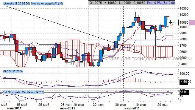 Согласно волновой теории Элиота, наблюдается реализация понижательного цикла. Отмечаем минимум первой понижательной волны на уровне 9800 пунктов. Далее произошло повышение котировок в рамках коррекционной волны покупок до уровня 10180 пунктов, что стало своеобразным ориентиром для выхода быков. На текущем этапе реализуется третья волна в районе 10000 пунктов.