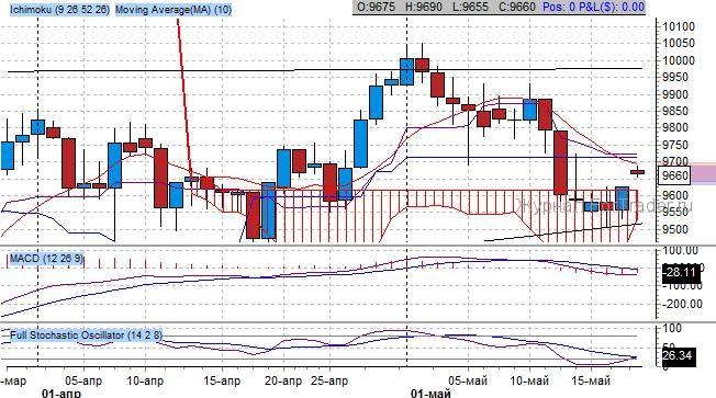 Согласно волновой теории Элиота, наблюдается реализация повышательного цикла. Ранее котировки на фьючерс продемонстрировали первую повышательную волну с уровня 9450 пунктов от 18 апреля до уровня 9750 пунктов от 24 апреля. Коррекционная вторая волна завершила свое действие на 9550 пунктов от 25 апреля – проторгованная область. Цены на фьючерс демонстрируют третью повышательную волну с текущим максимумом на уровне 10050 пунктов. Отмечаем завершение коррекционной волны с потенциалом до уровня 9550 пунктов. Ожидаем реализацию пятой повышательной волны с целью пробоя уровня 10000 пунктов.