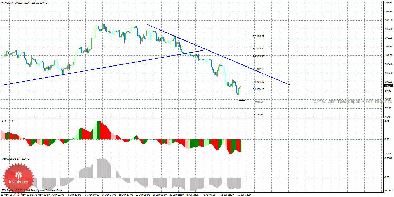 В ходе проведенного анализа движения цены на нефть, можно сделать вывод, что сейчас можно рассматривать ордера на продажу с целями 98,79 и 97,36. Стоп лосс выставляем выше ближайшего уровня сопротивления. При заходе сделки в прибыльность в безубыток. Если цена отскочит от уровня 100,22, это может засвидетельствовать продолжение нисходящего движения, как и разворот вниз индикатора OsMA. Длинные позиции сейчас не актуальны.