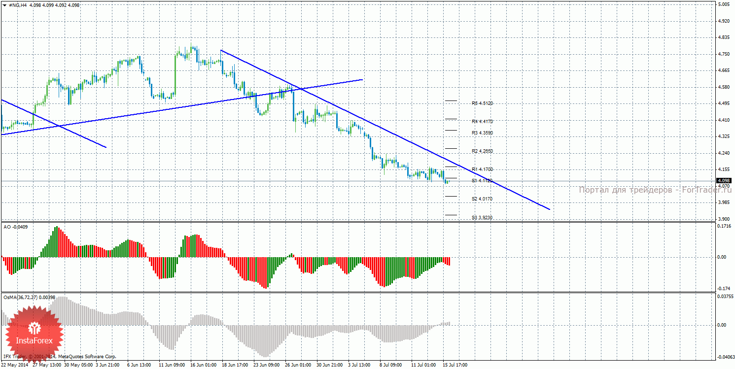 Анализ природного газа за 16 июля показывает, что цена продолжает нисходящее движение и закрепилась ниже уровня поддержки S1. На данный момент актуально нисходящее движение с целями уровни поддержки S2 – 4,0170 и S3 – 3,9230, если цена останется ниже уровня 4,1120. Целями для начала нового витка восходящей коррекции выступают уровни 4,1700 и 4,2650, если цена закрепится выше уровня 4,1120. Построена нисходящая линия тренда, которая оказывает поддержку торгующим на понижение и делает актуальными ордера на продажу. Индикатор Awesome показывает локальное нисходящее движение, последний закрытый бар окрашен в красный цвет. OsMA же направлен наверх, что сигнализирует о восходящем движении цены на газ в более долгосрочной перспективе. Отскок цены от уровня 4,0170 может спровоцировать начало восходящей коррекции.