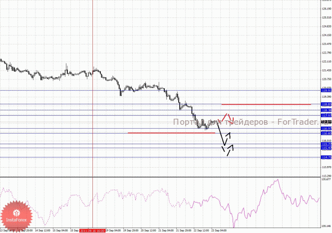 По паре Фунт/Йена ключевыми уровнями являются: 119.91, 118.85, 118.38, 117.97, 116.97, 116.60, 115.77, 115.47 и 114.75. Здесь мы продолжаем следить за локальным нисходящим циклом от 16 сентября. Продолжения движения к низу, ожидаем после прохода ценой диапазона 116.97 – 116.60, в данном случае цель 115.77, в коридоре 115.77 – 115.47 консолидация цены. Потенциальным значением для низа, считаем уровень 114.75, по достижении которого, ожидаем откат к верху. Корректировочное восходящее движение, возможно в диапазоне 117.97 – 118.38, пробой последнего значения приведет к углубленному движению, здесь цель 118.85, от этого уровня высока вероятность разворота к низу, его пробой будет располагать к развитию восходящей структуры, в данном случае потенциальная цель – 119.91.