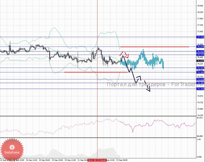 По паре Доллар/Йена ключевыми уровнями являются: 77.25, 76.87, 76.69, 76.57, 76.06, 75.90, 75.62, 75.48 и 75.26. Здесь мы следим за нисходящей структурой от 22 сентября. Краткосрочное нисходящее движение, ожидаем в диапазоне 76.06 – 75.90, пробой последнего значения приведет к развитию импульса, в данном случае цель 75.62, в коридоре 75.62 – 75.48 консолидация цены. Потенциальным значением для низа, считаем уровень 75.26, по достижении которого, ожидаем откат к верху. Корректировочное восходящее движение, ожидаем в диапазоне 76.57 – 76.69, пробой последнего значения окажет негативное влияние на развитие нисходящей структуры, в данном случае цель 76.87, этот уровень является ключевым сопротивлением для верха, его пробой позволит рассчитывать на движение к потенциальной цели – 77.25.
