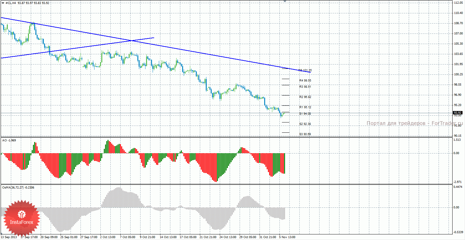 Анализ сырой нефти за 6 ноября показывает, что цена закрепилась ниже уровня поддержки 94,08, поэтому нисходящее движение может продолжиться, а индикаторы могут начать разряжаться. Нисходящее движение может продолжиться с целями S2 – 92,38 и S3 – 90,69, если цена останется ниже уровня 94,08. Может начаться новая восходящая коррекция с целями 95,12 и 96,82, в случае, если цена закрепится выше уровня 94,08. Нисходящая линия тренда сейчас является актуальной и оказывает поддержку торгующим на понижение. Индикатор Awesome показывает текущее нисходящее движение, так как последний закрытый бар красного цвета. OsMA же развернулся наверх, что говорит о восходящем характере движения в более долгосрочном плане. Закрепление цены выше уровня 94,08 может спровоцировать восходящую коррекцию. Оба индикатора могут начать разряжаться в ближайшее время.